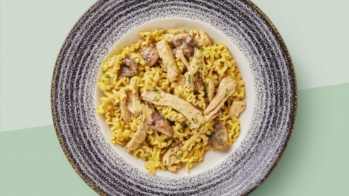 Strozzapreti pasta pasta pieces with pulled chicken and chestnut mushrooms in a creamy porcini sauce, enriched with mascarpone cheese and fresh parsley