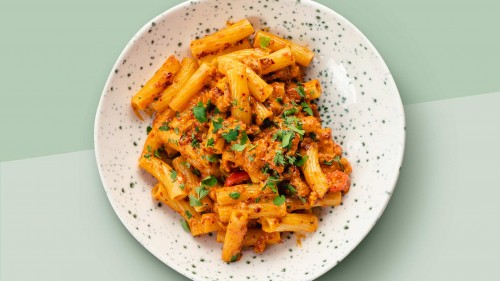 Rigatoni pasta with luganica and 'nduja sausage, cream, chilli and fresh parsley