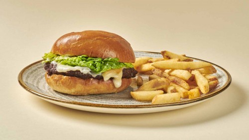 Beef burger with smoked cheese, baby gem lettuce and ketchup, in a brioche style bun. Served with your choice of fries or mixed salad