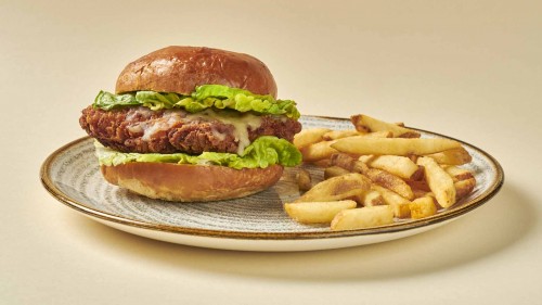 Buttermilk chicken fillet, baby gem lettuce, mayo and mozzarella, in a brioche style bun. Served with your choice of fries or mixed salad